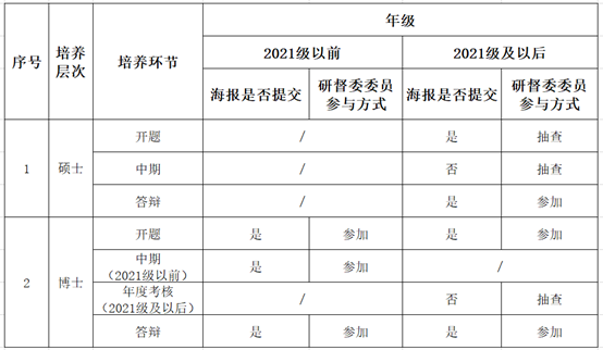 为进一步提高研究生培养质量,a片漫画 于2023年9月修订《a片漫画 研究生培养过程督导工作实施细则(试行)》(见附件1)。修订后各培养节点材料提交简表如下: