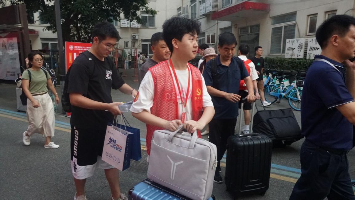 正门前准备了迎新展台供新生及家长打卡。“迎新的各位老师同学们辛苦啦!这里的迎新氛围很热闹,报到流程比我想象得还要简洁。我也很期待接下来的研究生生涯。”2024级硕士新生赵洪民说道。