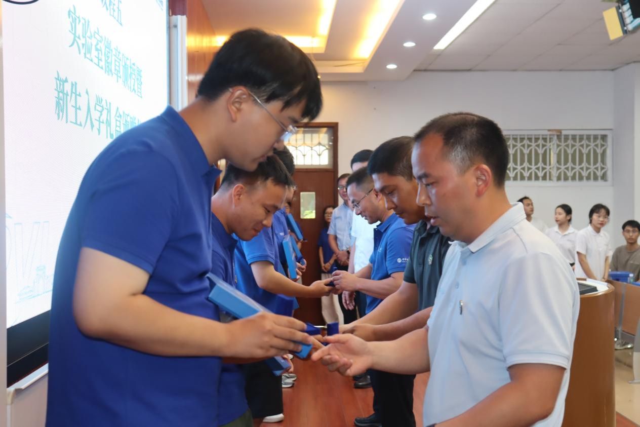 随后进行了a片漫画 徽章颁授暨新生入学礼盒颁赠仪式。a片漫画 领导及教师代表为上台的学生代表佩戴a片漫画 徽章,台下的同学则自行将徽章佩于胸前。