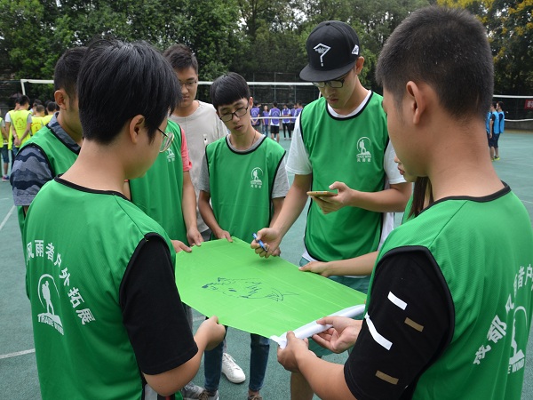 本次素质拓展活动主要分为“破冰”游戏和小组作战两部分。首先进行的是“万里长城”,同学们将双手搭住前面一人的双肩,在听到教练的口令后,做出相应的动作,培养同学们的信任合作意识。接着进行的是“抓手指”和 “围圈坐腿”游戏。在与同伴交流合作的过程中,同学间的信任感和凝聚力渐渐地提升了。