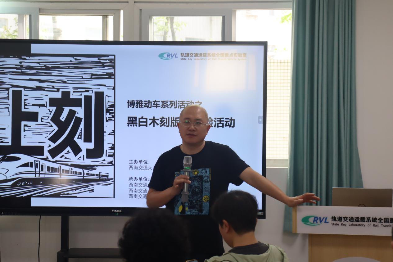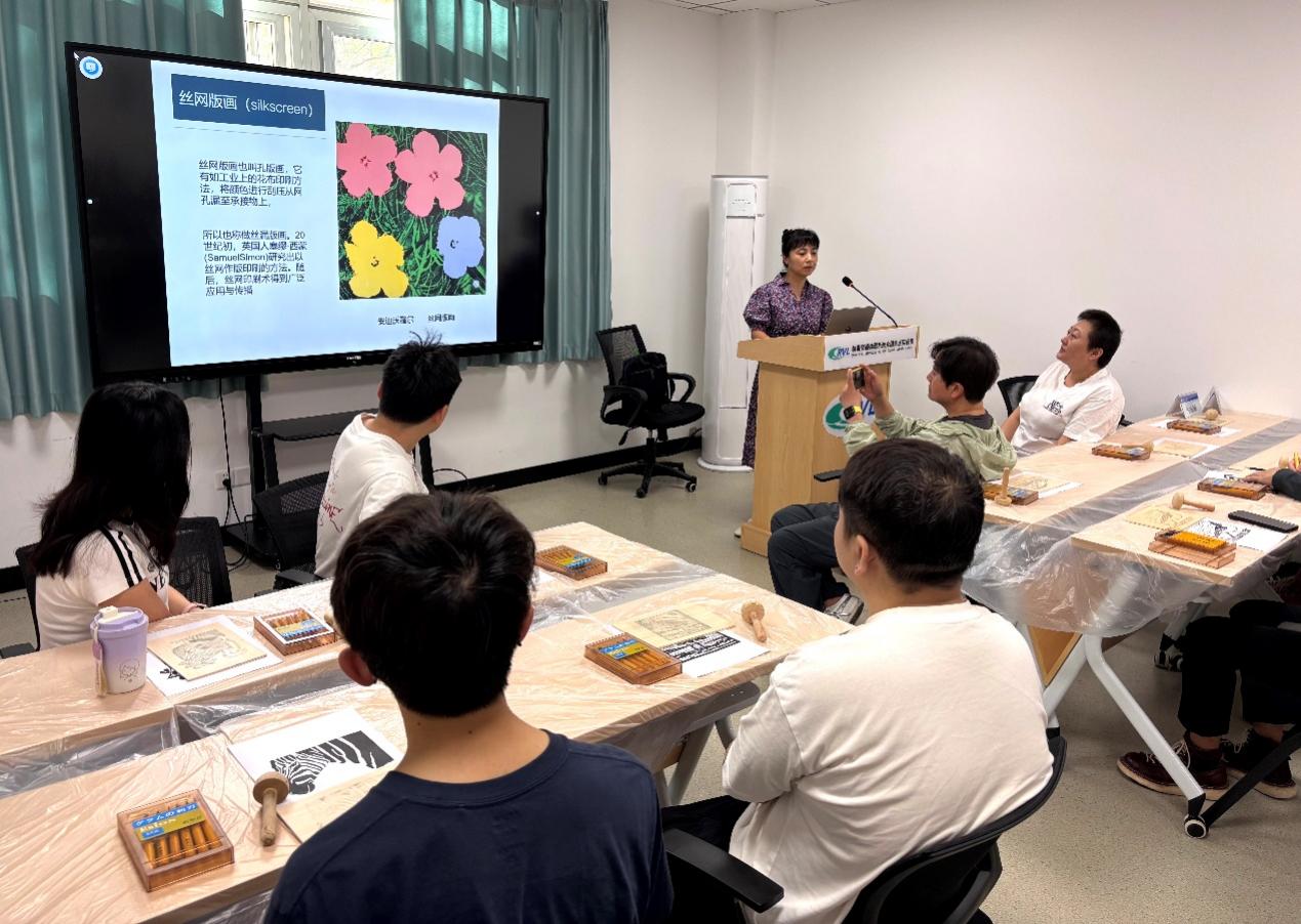 接下来,木刻版画指导环节正式开始,朱丽娅老师详细介绍了版画的发展历史、雕刻技巧、类型风格,并带领学生共同欣赏了几幅经典的木刻版画作品。朱丽娅老师指出,木刻版画是以刀代笔在木板上雕刻后印刷出来的艺术品,通常使用有限的几种颜色来表现画面,色彩之间相互对比强烈,具有很强的视觉冲击力和独特的艺术感染力。介绍完毕后,她还现场演示了雕刻过程和不同刀具的使用方法,并就雕刻印刷等步骤的注意事项进行了说明提醒。