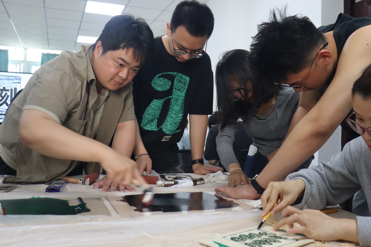 随后,现场30余名参与体验活动的师生有序分为五个小组,每人拿着一块木板和一套工具开展精心雕刻。每组配有一名指导老师或助教学生,帮助参与活动的师生更快上手,感受木刻版画的乐趣。