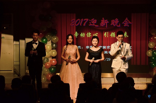 伴随着四名青春洋溢的主持人走上舞台,迎新晚会正式开始。首先,康国政主任发表开场致辞。康主任说道,迎新晚会的“新”有两个含义,一个是欢迎新同学们的到来,另一个是迎接即将到来的新年,并预祝大家度过一个美好难忘的夜晚。