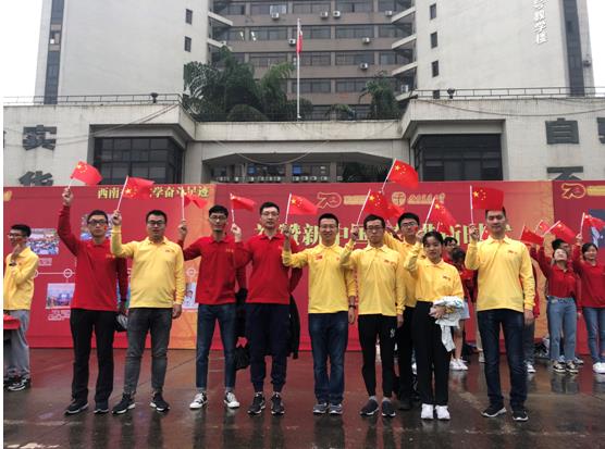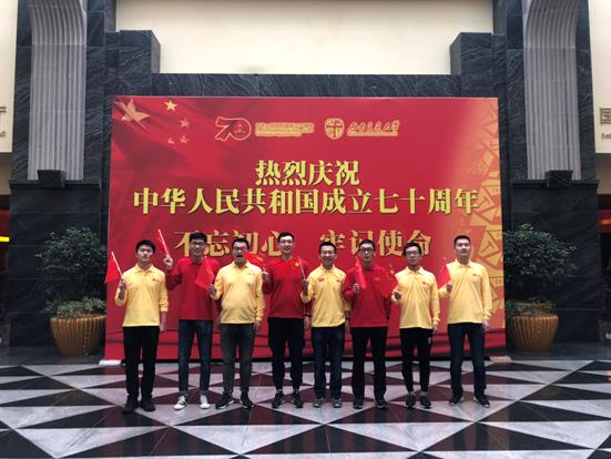 首先,在10月1号早晨,支部党员在学校0号综合楼前观看学校组织的升旗仪式。当天早晨,虽有秋雨当头,可支部党员观看升旗仪式的积极态度和分外热情却丝毫不减。按时到场、组织有序、态度严肃认真、精神饱满士气足,无不彰显着支部党员对本次升旗仪式的重视和认真。雄壮的《义勇军进行曲》奏响,支部党员同参加其他参加升旗仪式的同学高唱国歌,目送熠熠生辉的灿烂五星红旗升起。升旗结束后,全体参加人员同唱歌曲“我和我的祖国”,并高呼对祖国的祝语完成献礼祖国母亲微视频的拍摄。