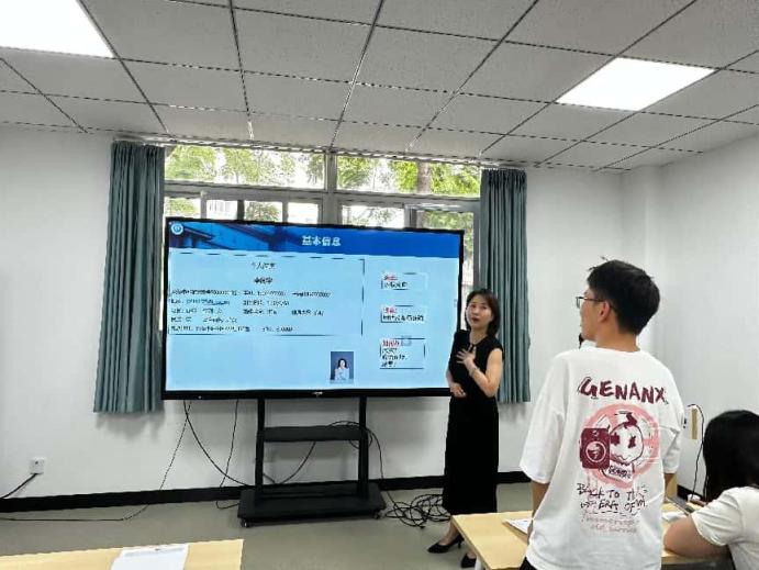 活动伊始,朱方方老师强调,简历是“求职的敲门砖”。她通过让同学们制作名牌的方式,说明了简历如何快速抓住HR眼球的重要性。她说:“大多数的情况下,HR初筛简历时,每份简历的停留时间可能仅有不到10秒钟。”这就要求同学们在制作简历时,精准对标企业及岗位需求,在排版上想办法着重突出个人知识储备、专业技能和综合素质,以求在短时间内吸引HR注意力,为自己争取更多机会。此外,朱老师还通过现场提问同学的方式,帮助大家加深对简历制作的认识。