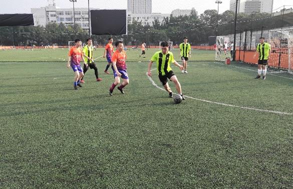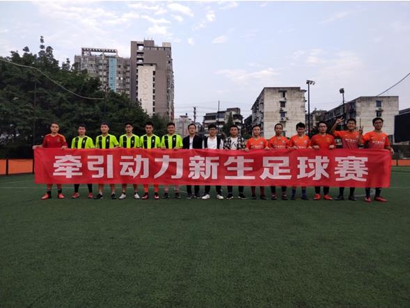 在九里校区足球场上开展了牵引足球友谊赛。参赛的两支球队分别为:由高年级学长组成且身着橙色队服的“壹队”,以及由研一新生组成且身着青色队服的“贰队”。