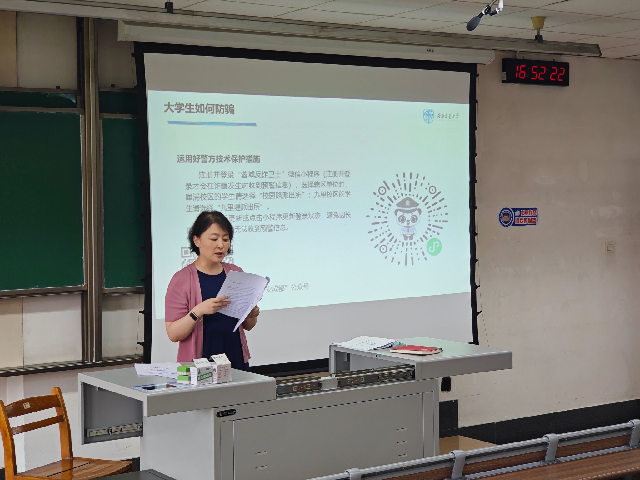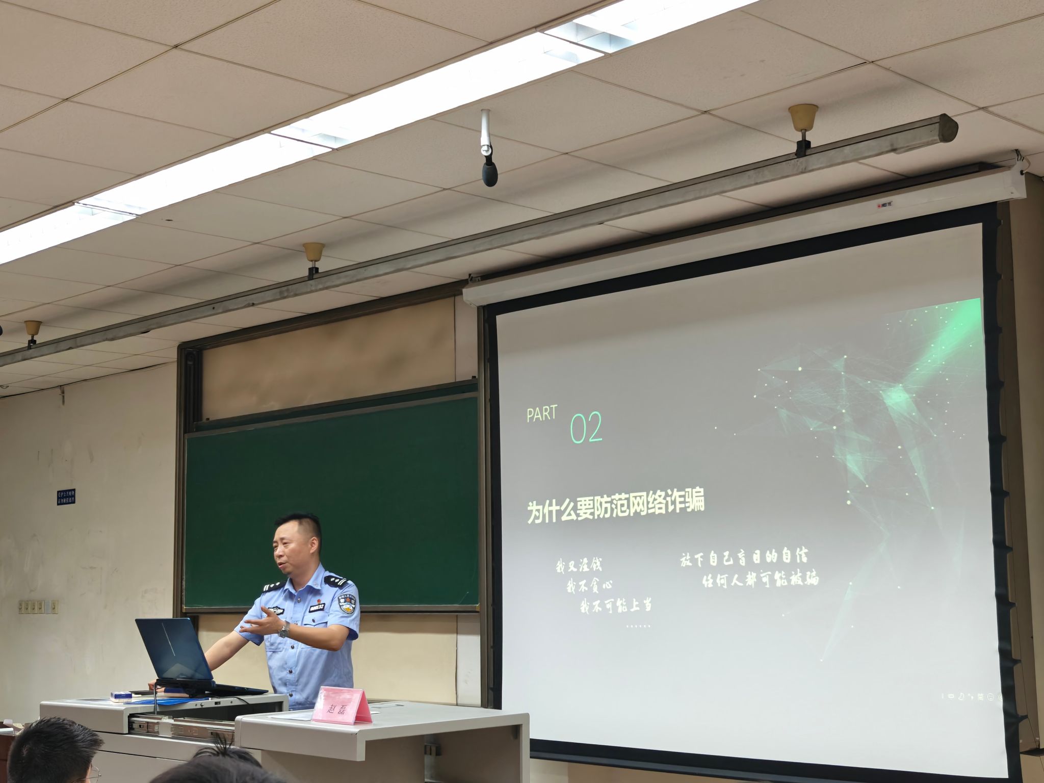 在九里校区J4209、J4138、J4423教室举办3次防范电信网络诈骗宣传教育讲座,并特邀九里堤派出所赵磊警官担任主讲。讲座中,赵警官围绕“什么是电信诈骗”“为什么要防范电信诈骗”“电信诈骗的主要方式”及“如何防范电信诈骗”四个角度展开,结合校园真实案例,让在场同学们全面了解刷单兼职诈骗、冒充熟人诈骗、粉丝团返现、租金诈骗、裸聊敲诈勒索等常见电信诈骗的犯罪机理和类型。他还深入浅出地介绍了各种诈骗的危害和识别诈骗方法,进一步增强了学生的网络安全意识,提升了学生预防电信诈骗的技能和自身防诈骗的水平。