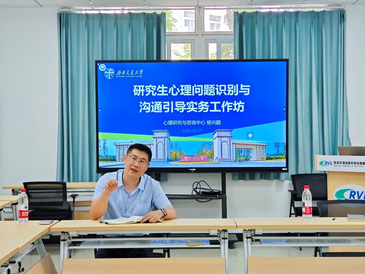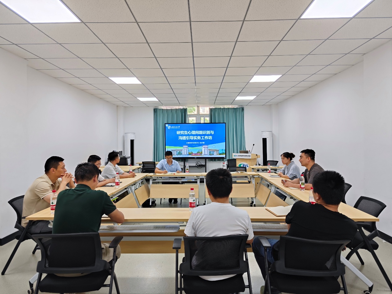 于6月27日下午在轨道运载B1楼209会议室组织开展研究生心理健康教育实务工作坊,主题是心理问题识别与沟通引导。本次活动特邀学校心理研究与咨询中心杨兴鹏老师担任主讲,8名近三年新入职教师、新遴选导师和学工组心理工作专项负责人申宇参加。