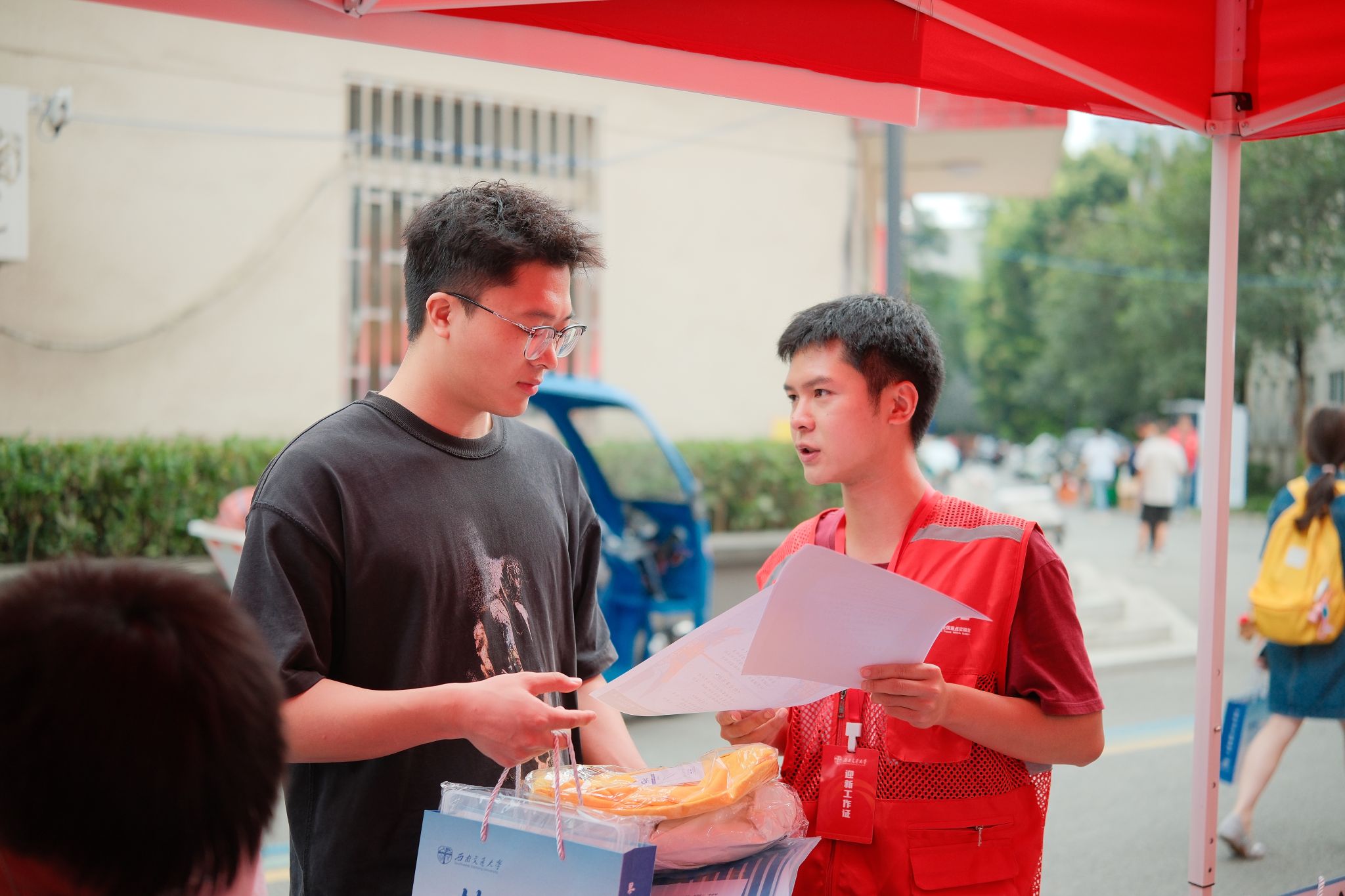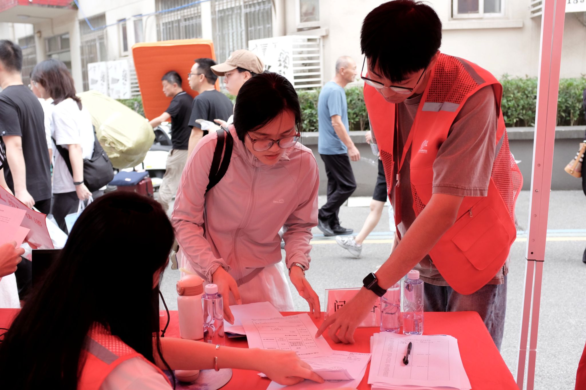 研究生会成员、朋辈年级师兄师姐和党员先锋队同学组成的志愿者团队,分布在报到注册区、材料审核区、物料发放区等各个岗位,为新生及家长提供全程引导和帮助,用实际行动诠释了“奉献、友爱、互助、进步”的志愿精神。