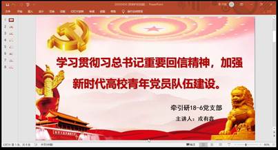 为了深入学习领会、全面贯彻落实习近平总书记给北京大学援鄂医疗队全体“90后”党员回信的重要精神,积极为决胜疫情防控阻击战贡献新时代青年党员的智慧和力量。牵引研18-6班党支部于4月30日通过腾讯会议的方式召开学习贯彻“习近平总书记重要回信精神加强新时代高校青年党员队伍建设”主题党日活动。此次主题党日活动由党支部书记戎有鑫主持,主要围绕“习近平总书记重要回信精神学习”、“青年战疫事迹视频学习”和“交流研讨”三个方面展开,支部全体党员、积极分子共20人参会。