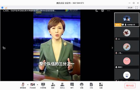 党课上,党支部书记刘卓昊同志和全体党员一起通过网络观看学习了习近平总书记给北京大学援鄂医疗队全体90后党员回信以及总书记“为打赢疫情防控阻击战提供科技支撑”引起的反响等视频。习近平总书记在回信中说到:“在新冠肺炎疫情防控斗争中,青年人同在一线英勇奋战的广大疫情防控人员一道,不畏艰险、冲锋在前、舍生忘死,彰显了青春的蓬勃力量,交出了合格的大考答卷。广大青年用行动证明,新时代的中国青年是好样的,是堪当大任的!”同时还向奋战在疫情防控各条战线的广大青年致以问候并鼓励全体青年要不惧风雨、勇挑重担,让青春在党和人民最需要的地方绽放绚丽之花!