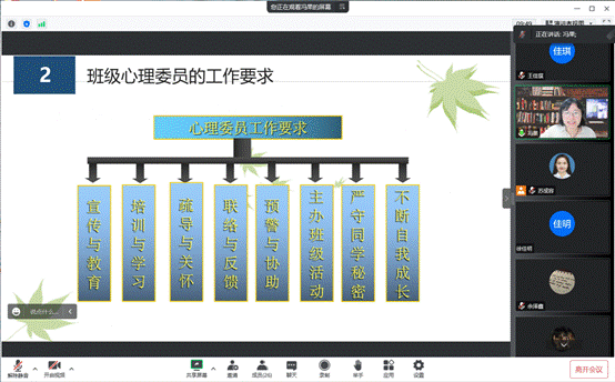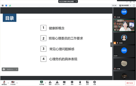 培训开始,冯果老师从“健康新概念、班级心理委员的工作要求、常见心理问题解惑、心理危机的具体表现”四个方面为大家介绍心理健康的相关内容。由于心理委员们没有心理学专业基础,为了方便大家理解,冯老师以通俗易懂的方式,结合案例讲解心理学的相关专业知识,心理委员们及时互动提出疑问或表示理解。