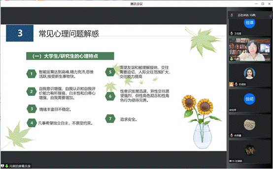 在讲到“常见心理问题解惑”时,冯果老师总结了七条研究生的心理特点,并列举了一些日常学习生活中常见的场景供心理委员们参考,如社交恐惧症同学在聚集性活动中的尴尬心理状态,优秀学生干部恐于处理人际关系等。这些虽然是个别同学可能出现的心理问题,但及时发现、多多关注则有利于提高班级同学的凝聚力和心理健康水平。