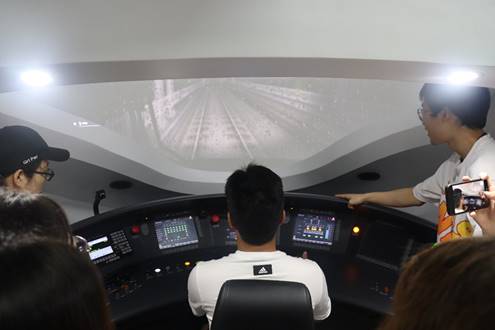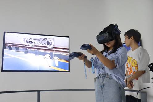 宋红霞就运达科技当前主要面向的国铁、城轨、高校三大主体业务内容及所其取得的成绩进行了介绍和展示。她表示:“经过数年的发展,运达从最开始的设备供应商升级到如今的方案解决商,提供智慧培训、智能运维、智慧车辆段、智慧牵引供电等5大解决方案,维保服务业务也在持续拓展中。”在高速列车司机AR智能培训设备与智能检修设备展厅,参观学生表现出浓厚兴趣,积极参与体验。