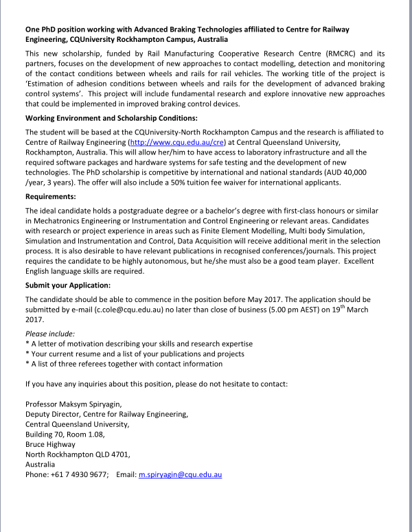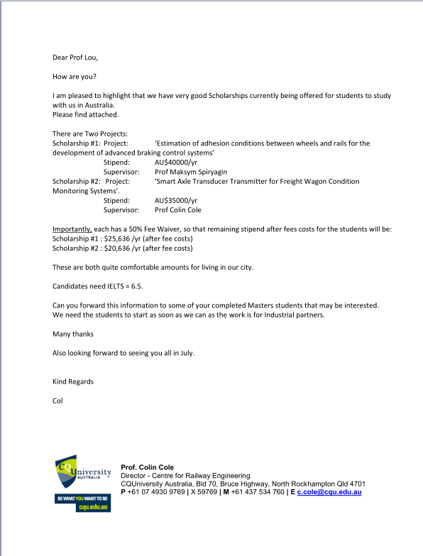 澳大利亚中央昆士兰大学铁路工程中心提供2名奖学金学生招聘信息