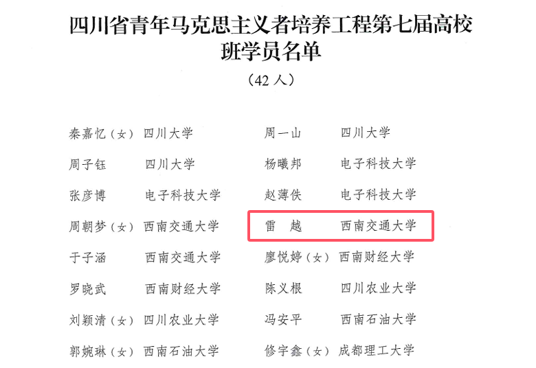 团委指导、校团委推荐,通过层层选拔成功入选为2024年四川省青年马克思主义者培养工程第七届高校班学员。据悉,本届四川省青马工程高校班共42人,届时将通过理论学习、党性教育、实践锻炼等方式,培养一批坚定可靠、堪当重任的优秀青年政治骨干。