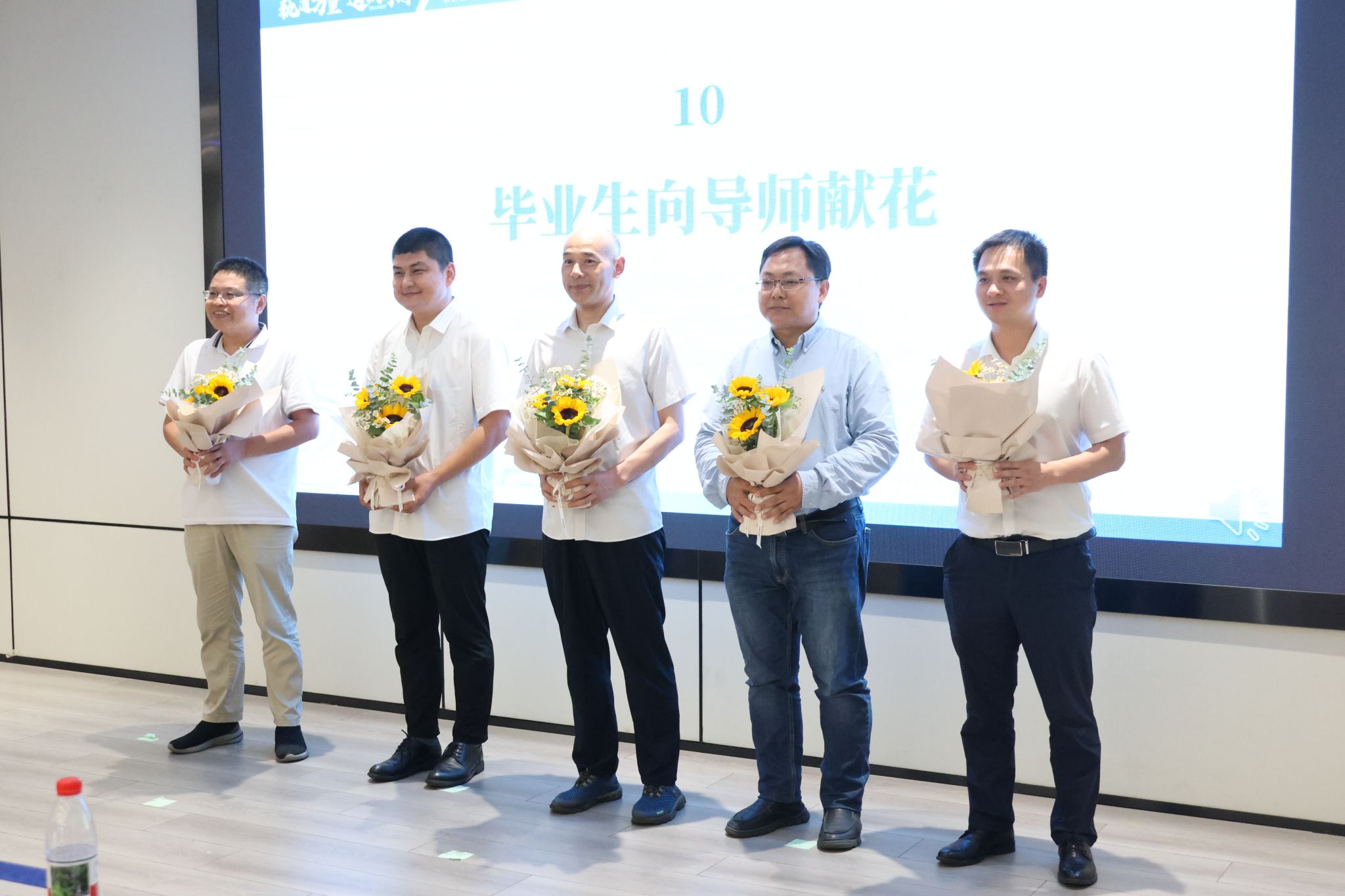 在毕业生向导师献花环节,学生代表们向丁建明老师、赵鑫老师、黄志辉老师、何庆烈老师、梅桂明老师献上鲜花,并深深鞠躬,感恩栽培。