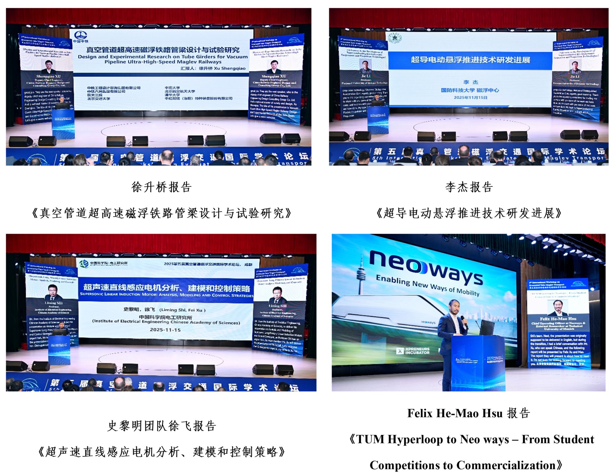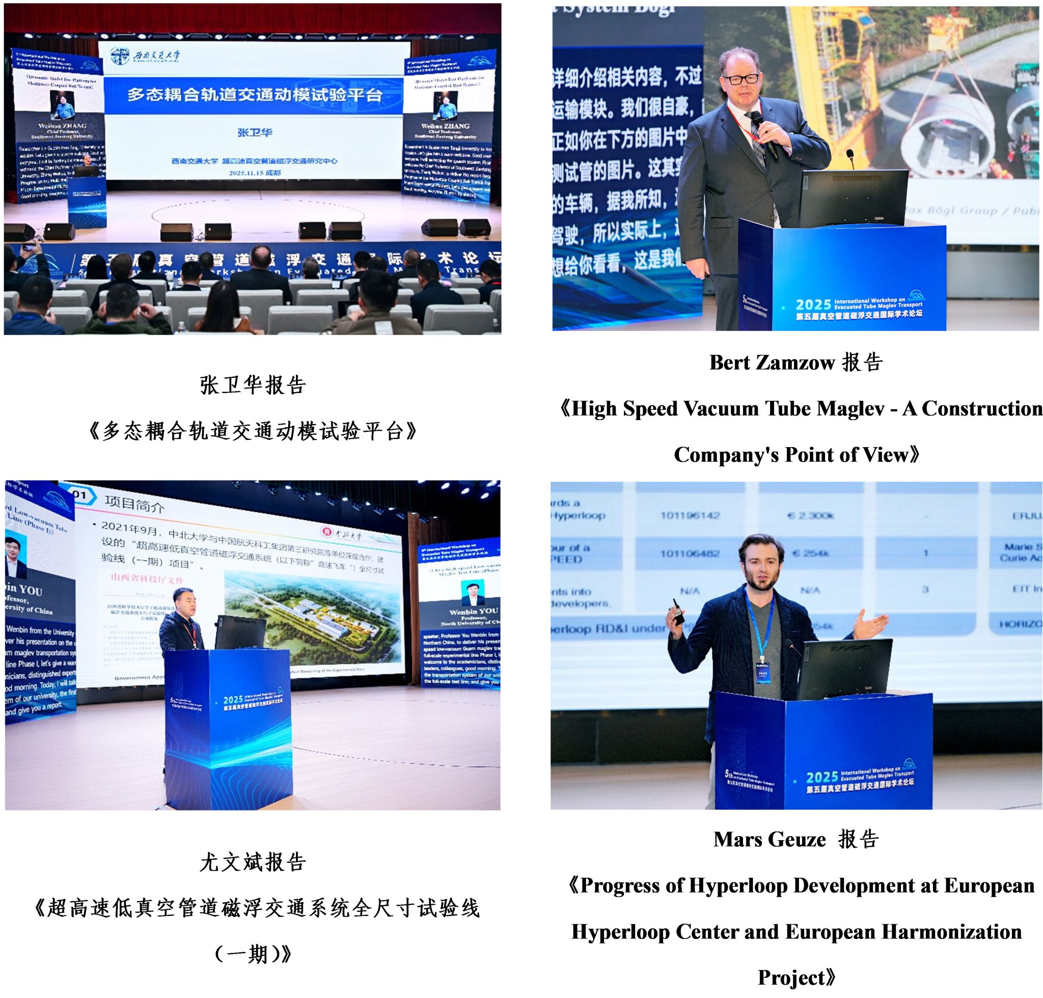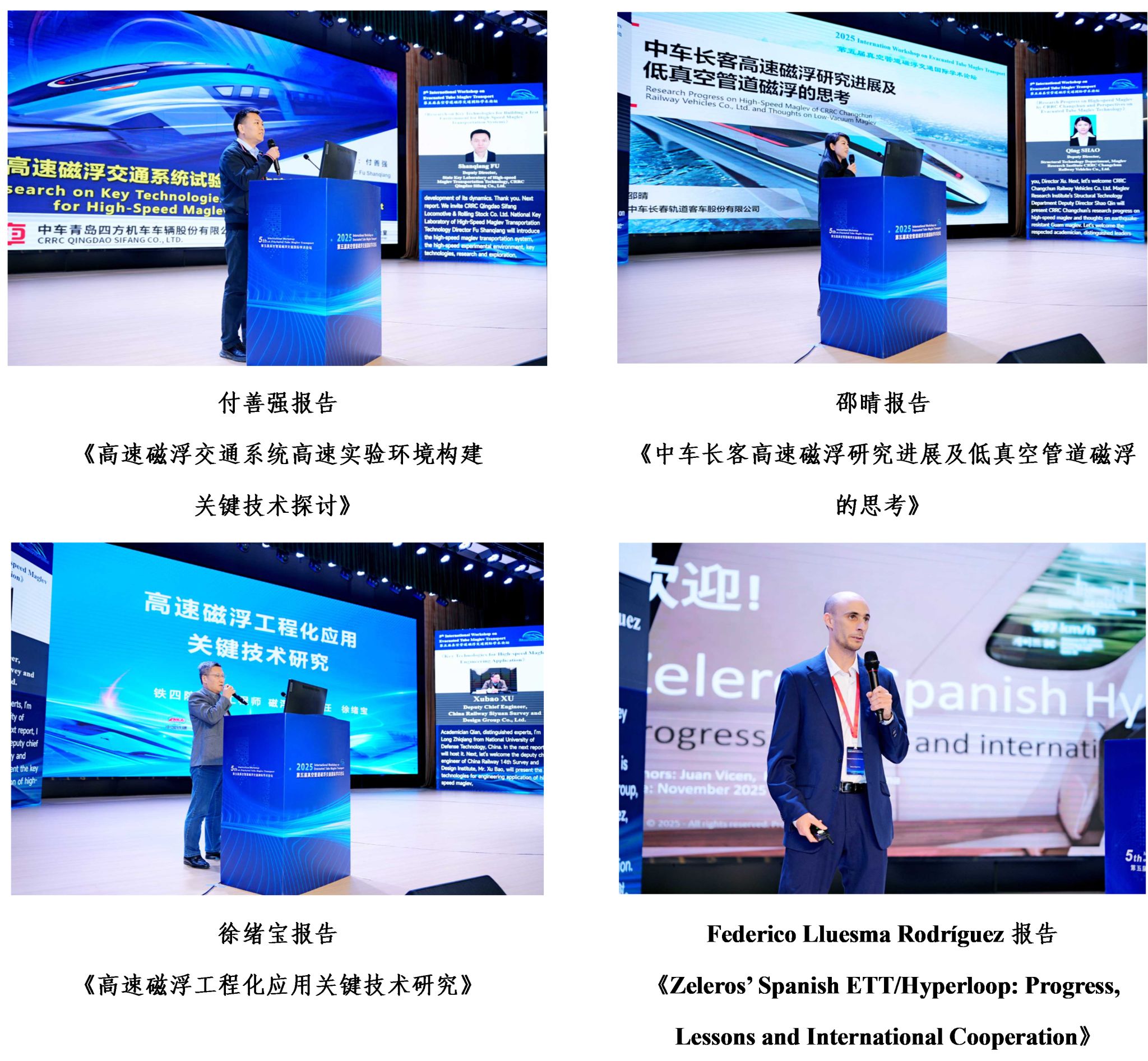、中铁二十三局、中铁工程设计咨询集团有限公司、中铁第四勘察设计院集团有限公司、中车时代电气股份有限公司、中车青岛四方机车车辆股份有限公司、中车长春轨道客车股份有限公司、中车唐山机车车辆有限公司、中国钢研科技集团有限公司、Max Bögl、HARDT Hyperloop、Technical University of Munich、Chalmers University of Technology、Zeleros Hyperloop等单位的18位专家就各自研究领域及相关技术成果进行了专题报告。