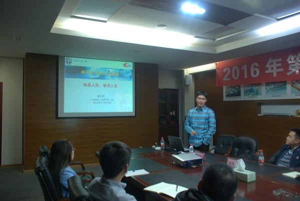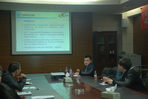 首先,开场主持人黄兆国简要介绍了到场的两位主讲人,在场响起了热烈的掌声。随后,朱胜阳博士讲述了自己硕博期间和海外期间的经历,对在座的研究生们做了很多建议,比如在科研道路上如何坚持克服重重困难,出国留学会有哪些需要注意的方面等等。接着,吴兴文博士结合自己18个月的海外科研经验,拿出自己的论文稿件向大家讲解写作,并指出各个需要注意的地方和细节。两位博士还和在场研究生讨论了科研以及生活上有趣的事情,分享了他们在的遇到的各种各样的经历与问题,以及当时的心态变化,如何在逆境中寻找到正能量,如何学会在压力中释放自己等。整个会议气氛轻松而热烈