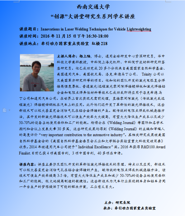【学术讲座】Innovations in Laser Welding Techniques for Vehicle Lightweighting