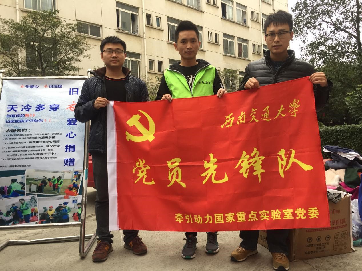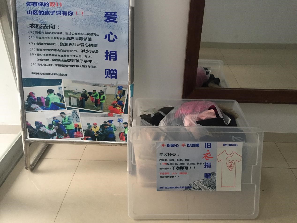 2016年11月22日,牵引硕士15级2班党支部和16级2班党支部成员,以及衣物接收方闲品再生公益组织工作人员,在眷诚斋15栋楼下举行了旧衣物转接活动,标志着为期一个星期的旧衣爱心捐赠活动告一段落.