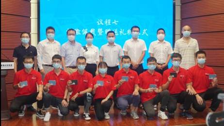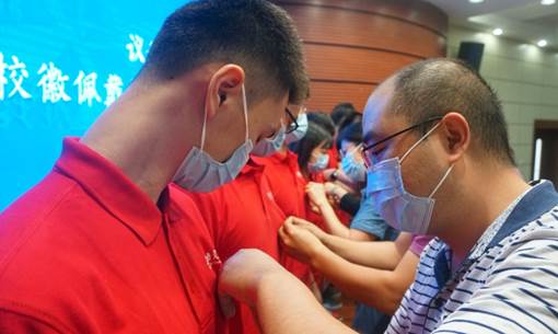 党政班子成员、导师代表、2020级新生班主任、教务员老师们为2020级新生代表佩戴校徽,并赠送了印有a片漫画