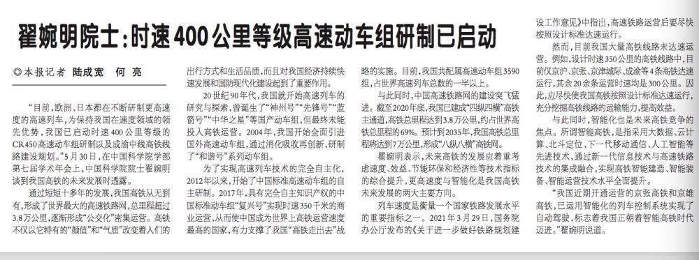 5月31日出版的《科技日报》第二版以《我国已启动时速400公里等级高速动车组研制》为题,报道了翟婉明院士报告会内容,全文如下: