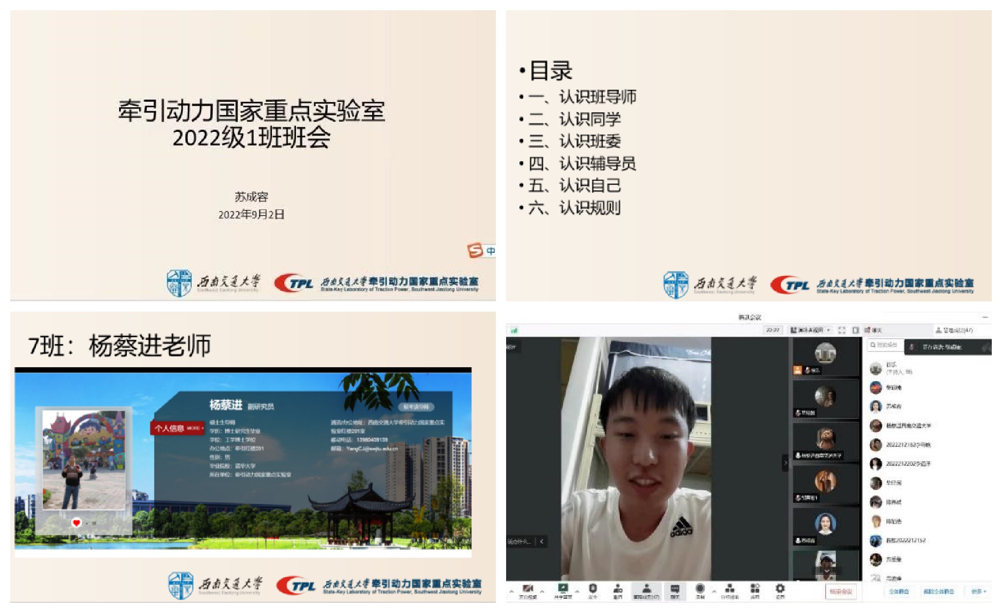 新生班级各班班主任精心准备,不但介绍了各班所在团队的科研情况,还向同学们提出许多学习就业相关的建议并祝愿同学们这三年学有所获。新生班级同学们也踊跃互动,在自我介绍过程中纷纷主动介绍了兴趣爱好。辅导员苏成容向大家开展了研究生日常管理以及疫情防控相关的事项的培训,尤其提醒同学们要及时配合“班级网格员”收集每日健康码和核酸情况。