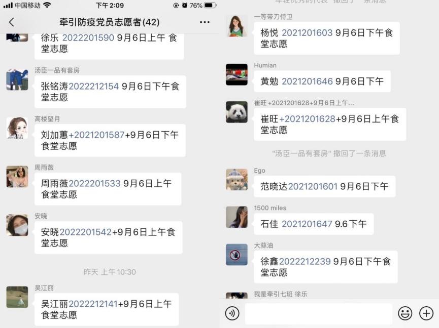 牵引22级硕士徐乐谈到:由于成都市疫情严峻复杂,特于9月6日中午参与了校区一食堂的秩序管理,主要负责提醒老师学生等人进出食堂务必戴好口罩,在食堂内打完饭即打即走,不聚集,不扎堆,不逗留,作为一名近满一年的中共预备党员来说,这次充分展示了自己全心全意为人民服务的决心,响应国家和党的号召,党员冲锋在前,在疫情面前不畏惧,不退缩,相信在大家的共同努力下,成都的社会面增加会逐步清零,这次志愿服务收获颇多,意义非凡。