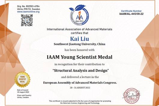 2019级博士研究生刘凯应邀在瑞典召开的“欧洲先进材料大会(European Assembly of Advanced Materials Congress)”上,在线作了题为“Bamboo-inspired energy-absorbing tubes used for rail vehicles”的学术报告,并荣获国际先进材料学会(International Association of Advanced Materials)青年科学家奖(IAAM Young Scientist Medal),以表彰他在“结构分析与设计”方面所做的创新工作,指导老师为敬霖研究员。