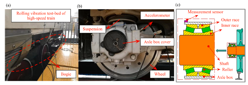 Fig. 19. (a) Experimental platform; (b) photographs of accelerometer installation; (c) structural diagram of the wheelset bearing.