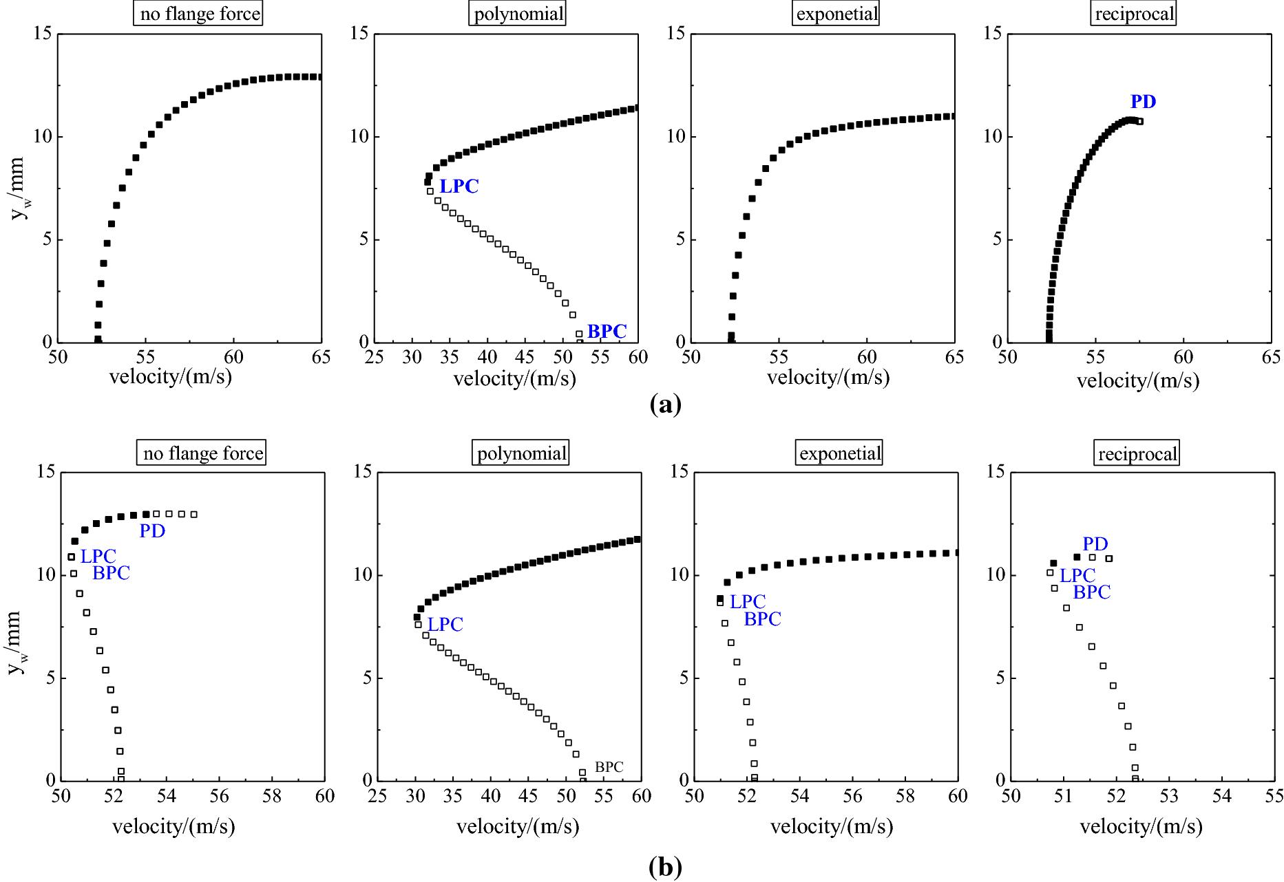 Fig. 6. Bifurcation map a case1 b case2 (open symbols stand for unstable limit circle, while solid ones for stable limit circle).