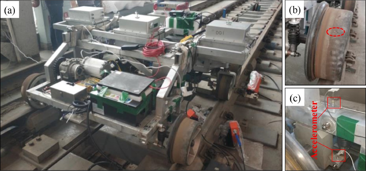 Fig. 22. Experimental setup for a railway model vehicle with a wheel flat. (a) The vehicle. (b) Wheel flat. (c) Vibration measurement.