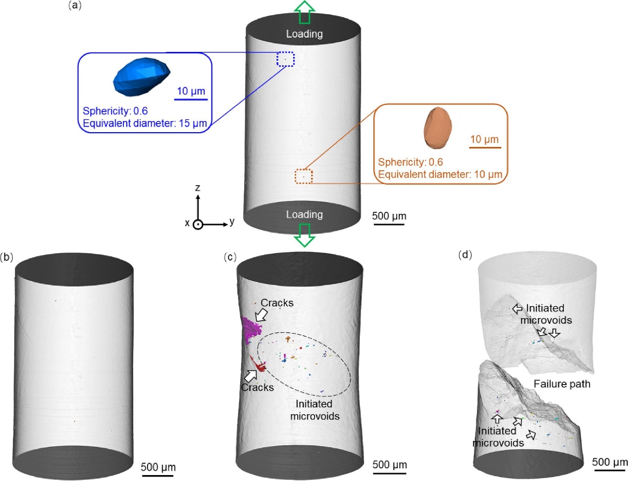 Fig. 8. 3D renderings taken from SR-μCT images of an HRAM-processed tensile specimen loaded to (a) 0 MPa, (b) 813 MPa, (c) 862 MPa, and (d) 906 MPa. The sphericity of the defect is defined as π1/3(6 V)2/3/A, where A is the surface area and V is the volume. The equivalent diameter is calculated based on a sphere with the same volume as the defect.