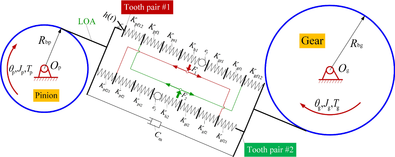 Fig. 1. Dynamics model of a spur gear transmission with coupling effect between tooth pairs in mesh.