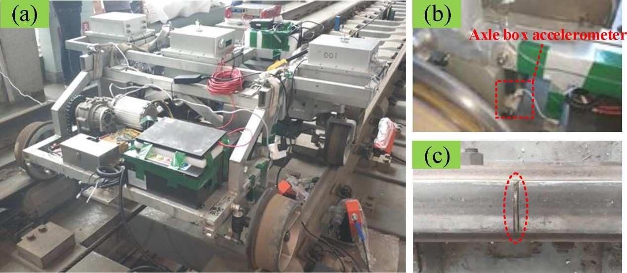 Fig. 14. Experimental setup: (a) railway vehicle; (b) axle box accelerator position; (c) gap for squat approximation.